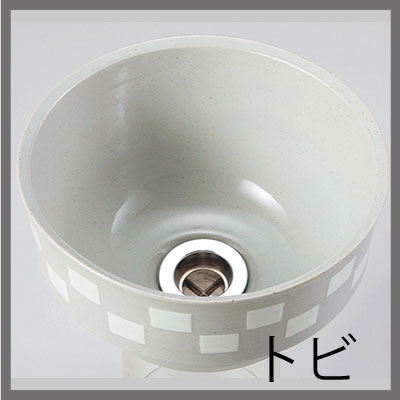 力強いストライプがのびやかさを感じさせる「オビ」・・・ リズミカルに描かれた四角ドットがほのぼのとした雰囲気を醸し出す「トビ」・・・ ナチュラルでミニマムな模様、素材の持ち味を生かした控えめな色調がこの手洗器の魅力となっています。
