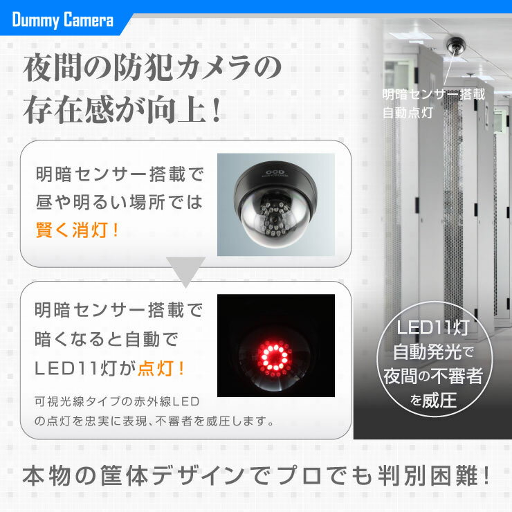 日本の企業が品質管理!信頼の安心品質! シンプルなデザインでスマートに簡単防犯対策! LEDランプ11灯と明暗センサー搭載で夜間の存在感が向上!! ◎住まいや駐車場・お店などに設置することで手軽に防犯対策! ◎本物志向のケースを採用でプロでも判別困難! ◎高性能仕様な外観と赤外線暗視カメラ風のリアルなデザインで、不審者を威圧します。